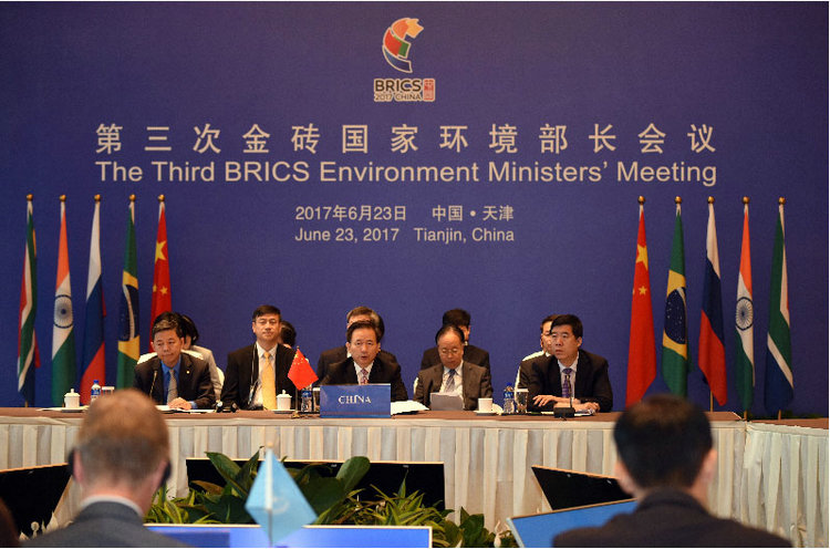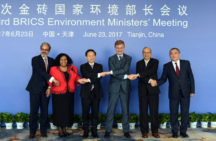 2017年6月23日,第三次金磚國家環(huán)境部長(cháng)會(huì )議在天津舉辦。環(huán)境保護部黨組書(shū)記李干杰出席并主持會(huì )議,南非環(huán)境事務(wù)部部長(cháng)艾德娜·莫萊瓦(女),印度環(huán)境、森林與氣候變化部常務(wù)副部長(cháng)阿杰·納拉揚·賈,巴西環(huán)境部代表團團長(cháng)費爾南多·科伊姆布拉,俄羅斯自然資源與生態(tài)部代表團團長(cháng)努里丁·伊納莫夫出席會(huì )議。聯(lián)合國副秘書(shū)長(cháng)、聯(lián)合國環(huán)境署執行主任埃里克·索爾海姆應邀參加會(huì )議。中共天津市委書(shū)記李鴻忠會(huì )見(jiàn)參加第三次金磚國家環(huán)境部長(cháng)會(huì )議的全體部長(cháng)、代表團團長(cháng)和埃里克·索爾海姆,天津市副市長(cháng)孫文魁發(fā)表致辭,歡迎前來(lái)參會(huì )的各位嘉賓。