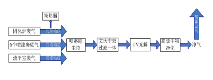 廢氣凈化系統作業(yè)時(shí),固化爐廢氣、噴漆房和流平室廢氣匯集一根總管,風(fēng)機啟動(dòng),抽排廢氣,隨著(zhù)風(fēng)力,收集的漆霧粉塵和有機廢氣先經(jīng)噴淋除塵塔去除大部分的漆霧粉塵;再進(jìn)入文氏中效過(guò)濾一體設備過(guò)濾除去廢氣中逃逸的漆霧及水霧;經(jīng)除塵除漆霧后的廢氣進(jìn)入UV光解凈化設備,運用高能UV紫外線(xiàn)光束對廢氣進(jìn)行協(xié)同分解氧化反應,使廢氣中部分有機污染物降解轉化成低分子化合物、水和二氧化碳;最后,廢氣進(jìn)入高效生物凈化器,通過(guò)培養生長(cháng)在生物凈化器內的特殊微生物形成的生物膜,此生物膜一方面以廢氣中的有機污染物為養料,進(jìn)行生長(cháng)繁殖,另一方面將廢氣中的有味的揮發(fā)性有機物質(zhì)(VOC)作生物分解及脫臭處理,降解成為無(wú)毒無(wú)味的二氧化碳(CO2)和水(H2O)后再排出,達到凈化廢氣的目的。其中,固化爐廢氣在匯集進(jìn)入總管前,采用換熱器將廢氣中熱量回用于固化爐作業(yè),在降低廢氣溫度的同時(shí)減少熱量損耗。